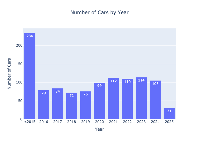 Analyzing the data on available Turo listings by model year reveals interesting trends. The majority of listings come from vehicles manufactured in 2015 or earlier, totaling 234 units. However, newer models are gaining traction, with 2023 models leading the pack at 114 listings, followed closely by 2021 and 2022 models with 112 and 110 listings, respectively. The 2024 models show a strong presence as well, with 105 listings. Interestingly, the count for 2025 models is significantly lower at just 31, indicating that hosts may be hesitant to list very new vehicles. This data suggests that while older models dominate the market, there is a growing demand for newer vehicles, particularly those from the last three years.