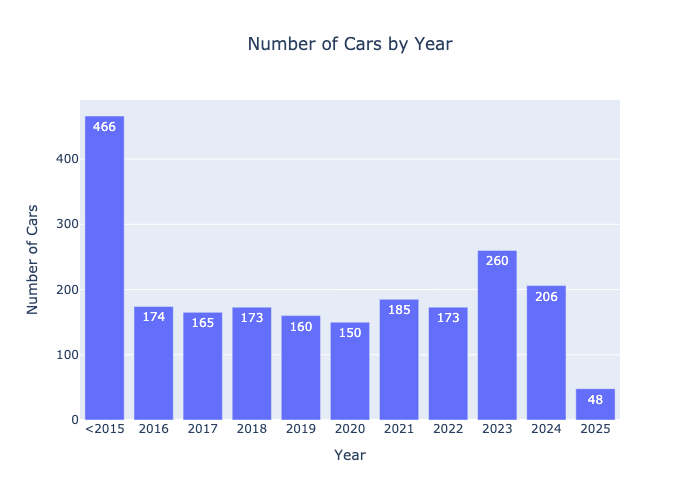 Analyzing the available listings by model year reveals interesting trends in the Turo marketplace. The oldest models, those from 2015 or earlier, dominate the listings with 466 vehicles. However, newer models are gaining traction, particularly the 2023 and 2024 models, which have 260 and 206 listings, respectively. Notably, the 2021 model year shows a strong presence with 185 listings, while the 2025 models are just starting to emerge with 48 listings. This data indicates a growing interest in newer vehicles, suggesting hosts may benefit from updating their fleets to attract more renters.