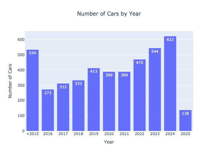 Analyzing the available listings by model year reveals interesting trends in the Turo marketplace. The data shows that vehicles from 2024 have the highest number of listings at 622, followed closely by 2023 with 544 listings. Interestingly, older models (2015 or older) collectively account for 534 listings, indicating a steady interest in vintage or budget-friendly options. The years 2019 and 2022 also show strong performance with 413 and 470 listings, respectively. However, listings for 2025 are notably low at just 138, suggesting that hosts may be cautious about listing newer models too early.