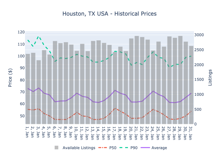 In January 2025, Turo hosts experienced notable fluctuations in pricing and availability. The average daily rental price (mean) ranged from $61.09 to $73.30, while the median price (P50) varied between $47.0 and $56.5. The P90 price, representing the top 10% of listings, peaked at $116.95, indicating a diverse pricing strategy among hosts.