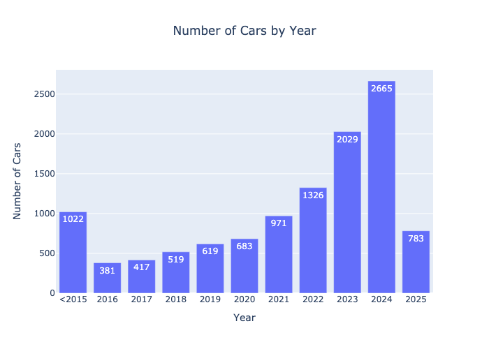Analyzing the available Turo listings by model year reveals a clear trend towards newer vehicles. The data shows that models from 2015 or older account for 1,022 listings, while the number of listings increases significantly for newer models. Notably, the year 2024 leads with 2,665 listings, followed closely by 2023 with 2,029. This indicates a growing preference for newer vehicles among hosts, likely driven by demand for modern features and improved reliability.