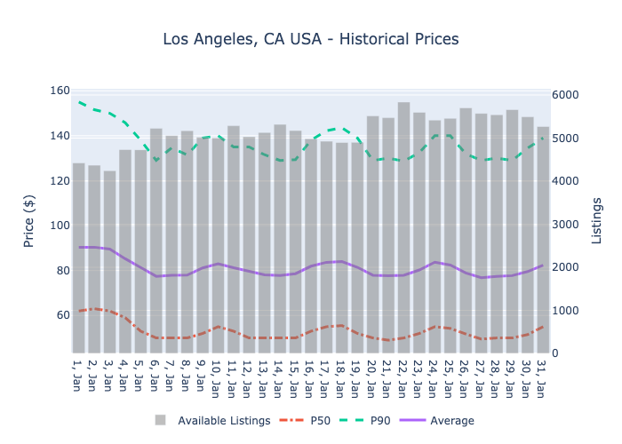 In January 2025, the car rental market in Los Angeles showcased a dynamic range of pricing and availability. The average daily rental price (mean) fluctuated around $90.33, with a median price (P50) of $62.00 and a 90th percentile price (P90) reaching $155.00. The total volume of listings varied significantly, peaking at 5,837 listings on January 22.