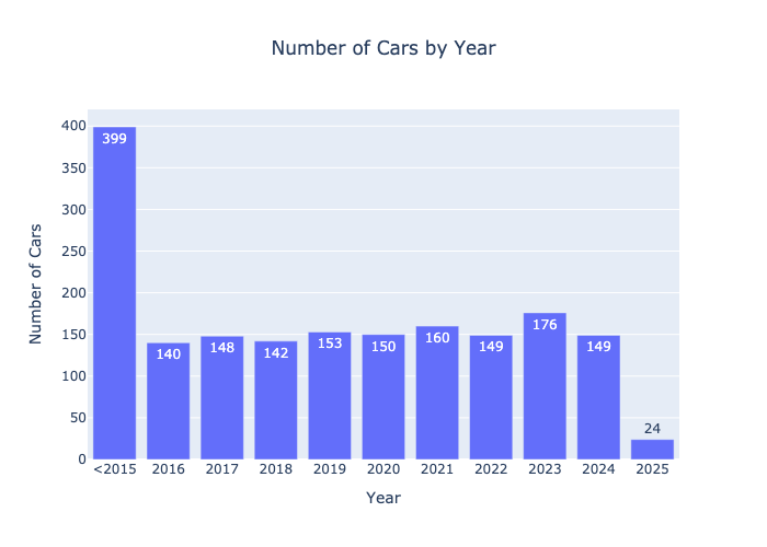 Analyzing the available Turo listings by model year reveals interesting trends in vehicle availability. The largest group consists of older models (2015 or older), with 399 listings. In contrast, newer models show a gradual increase in availability, peaking in 2023 with 176 listings. The years 2021 and 2020 also demonstrate strong numbers, with 160 and 150 listings, respectively. However, the count drops significantly for 2025, indicating a potential lag in new listings for the upcoming model year. This data suggests hosts should consider the demand for newer vehicles while also recognizing the substantial market for older models.