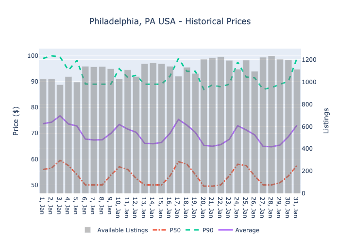In January 2025, Turo hosts experienced notable fluctuations in pricing and availability. The median price (P50) ranged from a low of $49.5 to a high of $59.5, while the 90th percentile price (P90) peaked at $100. This indicates a competitive market with varying demand.